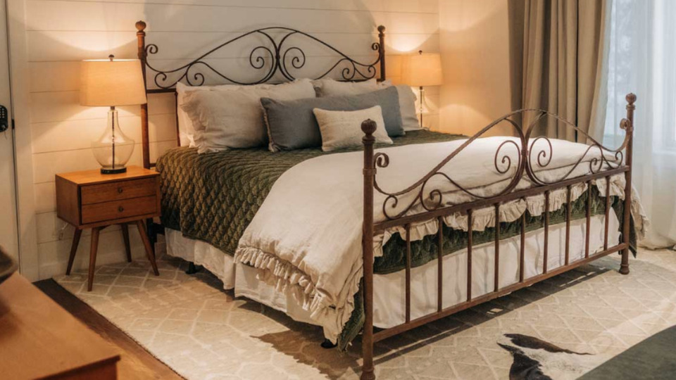 THE ROOST LOFT SUITE. The master suite upstairs in The Roost upscale farmhouse, featuring a large bedroom, comfortable king sized bed and a clawfoot bathtub in the private bathroom. Enjoy privacy with access to the large kitchen, shared living room and inviting dining room. $1850 per person